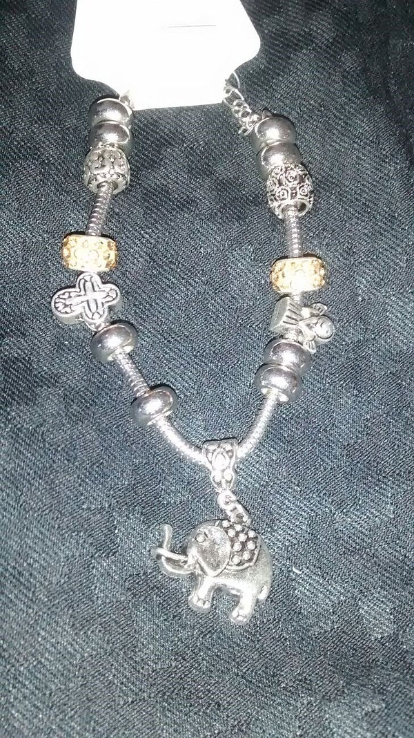Pulseira de metal com preendedor, pingentes de cruz, anjo e elefante R$ 20,00 na Charm